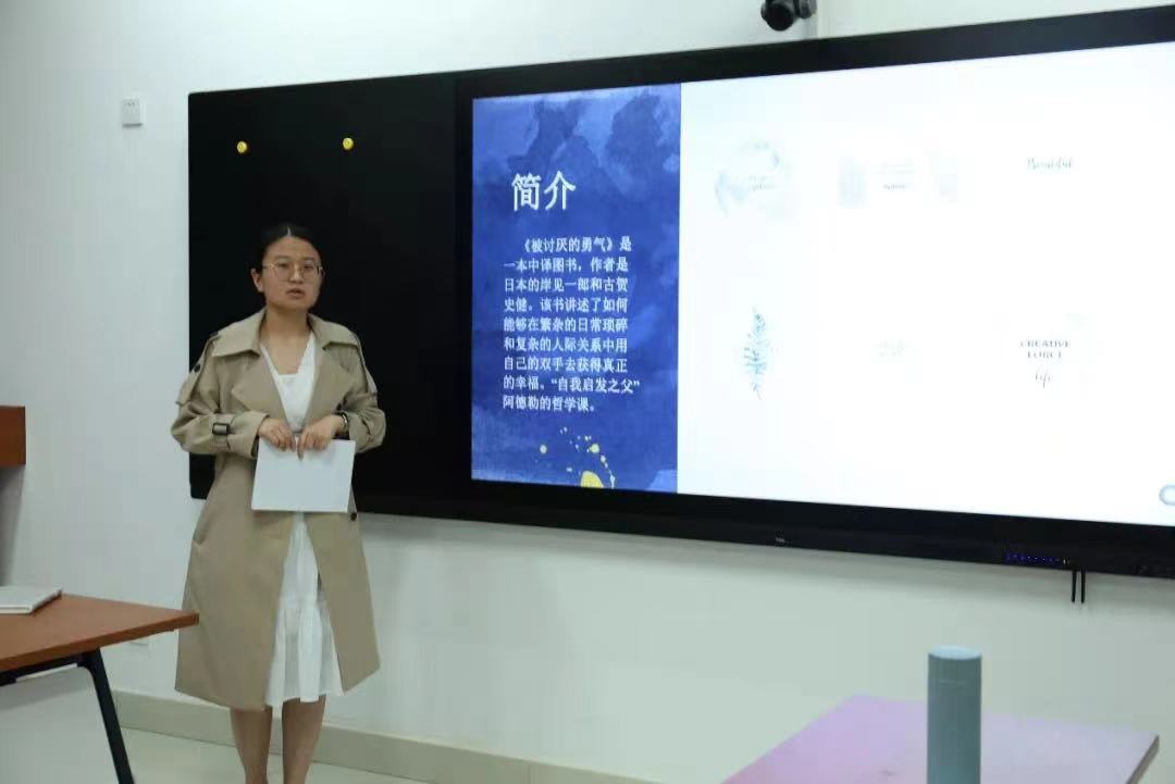 21级的赵艺菡同学推荐的书目是《自卑与超越》,她从作者简介、作品介绍、语句分享、章节分享四部分对《自卑与超越》做一简单交流,在章节分享中从自卑感、追求优越感、奉献三个的关键词入手得出克服自卑感的最好办法即直面它,确立正确的优越感目标克服它,并在克服的过程中以最大的程度去关注他人、与他人合作、奉献社会,这就是最好克服自卑、超越自己的方法的结论。