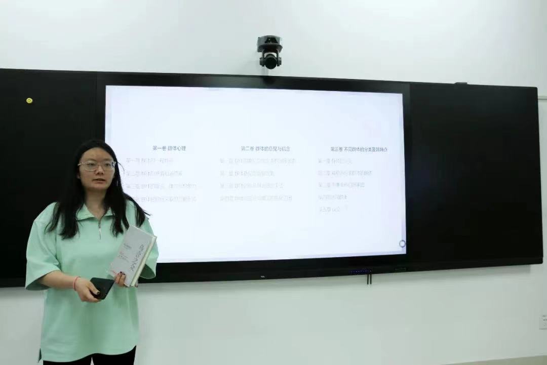 21级的焦禹涵同学介绍了1895年由法国著名心理学家古斯塔夫·勒庞的《乌合之众》。她通过一些例子引出与当今世界网络迅速发展现状下产生的网络暴力,同时阐述个人独处和群体生活对每个人来说都是十分重要的,只希望我们每个人在群体身份和个人本体的切换中能够保持清醒,不随意盲目从众泯灭自己的个性,也不肆意宣扬个人主义,要保持一定和谐性。