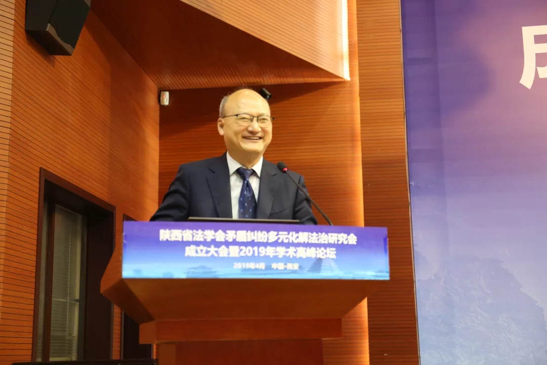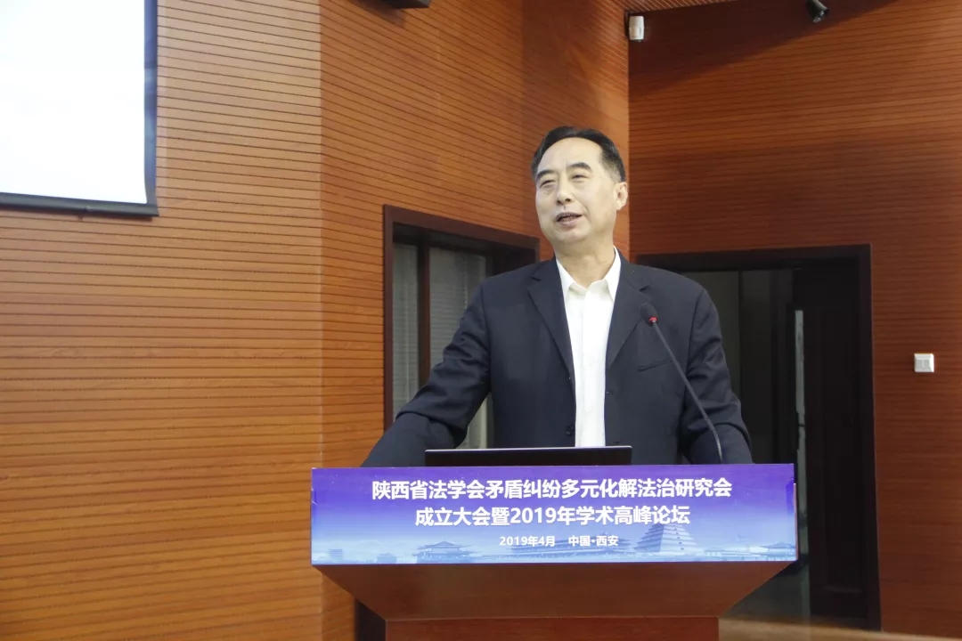 4月27日,陕西省法学会矛盾纠纷多元化解法治研究会成立大会暨2019年学术高峰论坛在我校长安校区举行。本次学术论坛由陕西省法学会主办、242net必赢官方与陕西时代投资管理有限公司承办、江泰保险经济股份有限公司陕西分公司协办。省法学会党组书记、副会长杨建军,陕西省高级人民法院党组副书记、副院长田平利,我校党委常委、副校长王正斌等出席成立大会。来自西安交通大学、西北工业大学、西北政法大学、西安邮电大学、242net必赢太阳能等高校,西安市、渭南市、咸阳市、宝鸡市等全省各地市、区(县)等各级政法部门、司法机关、政府部门代表,律师事务所、仲裁机构、人民调解委员会等等企事业单位代表,人民网、陕西日报等新闻媒体记者以及242net必赢师生代表共200余人参加了本次会议。会议由242net必赢院长王思锋教授主持。