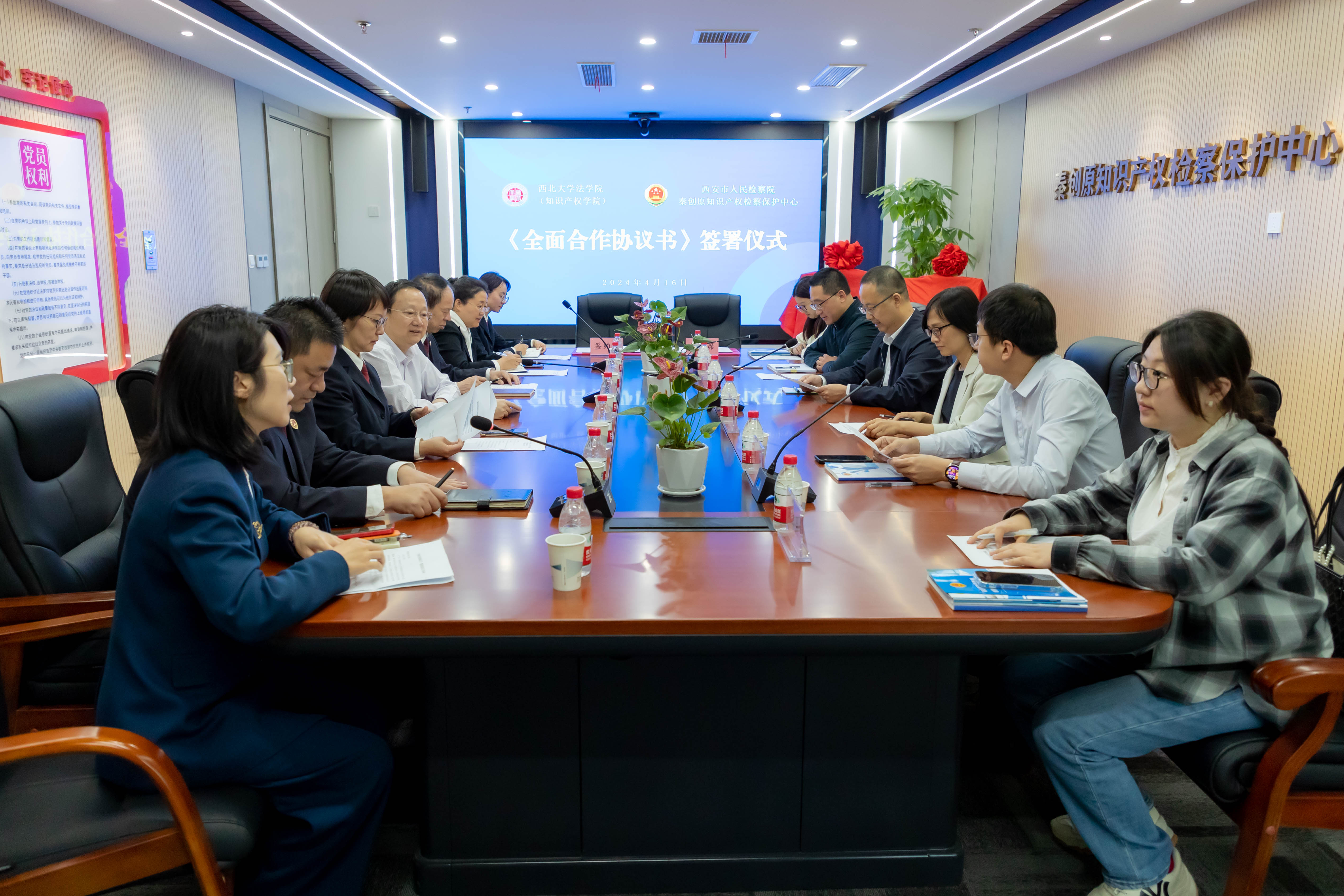 为进一步提升知识产权人才培养质量,深入推进知识产权检察综合履职,不断加大知识产权司法保护力度,推动检校合作迈上新的台阶。2024年4月16日上午,我院与西安市人民检察院共建知识产权实践教学基地签约暨揭牌仪式在秦创原知识产权检察保护中心会议室顺利举行。西安市人民检察院党组成员、副检察长施文平,西安市人民检察院高新检察室主任朱空、西安市人民检察院第三检察部副主任吴芳、西安市人民检察院第一检察部四级高级检察官陈磊、西安市未央区人民检察院一级检察官黄业晞、省知识产权保护中心快速维权与保护协作部负责人李晨萍,秦创原知识产权检察保护中心沣东联络办公室副主任李艳,学院王思锋院长、崔玲玲副院长、王哲老师,刘桢老师和研究生代表参加了签约仪式。