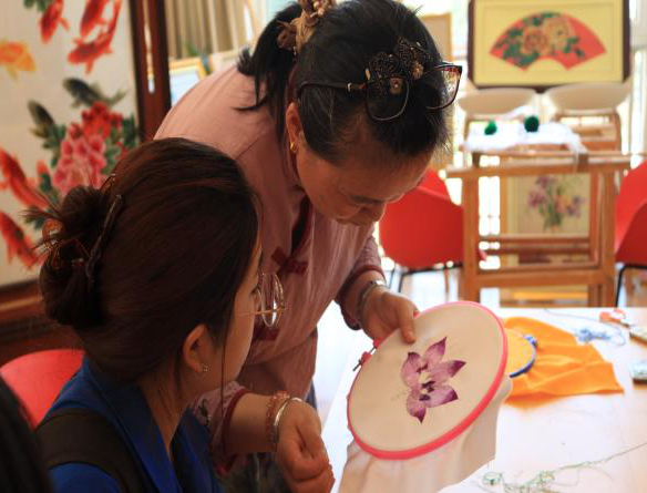 刺绣发展一片光明的背后,也存在着一定的问题。赵老师在采访过程中遗憾地表示,“大部分‘非遗进校园’活动只局限在小学校园里,难以让刺绣走进高校,其他年龄段的孩子们很难有机会接触刺绣。”第七代刺绣传承人王倩老师带领成员们参观基地时也表示,目前,学徒们的平均年龄较高,刺绣这门技艺缺少年轻人去学习。“如果有更多年轻人加入刺绣的学习与传承,我相信刺绣会发展得更快。”